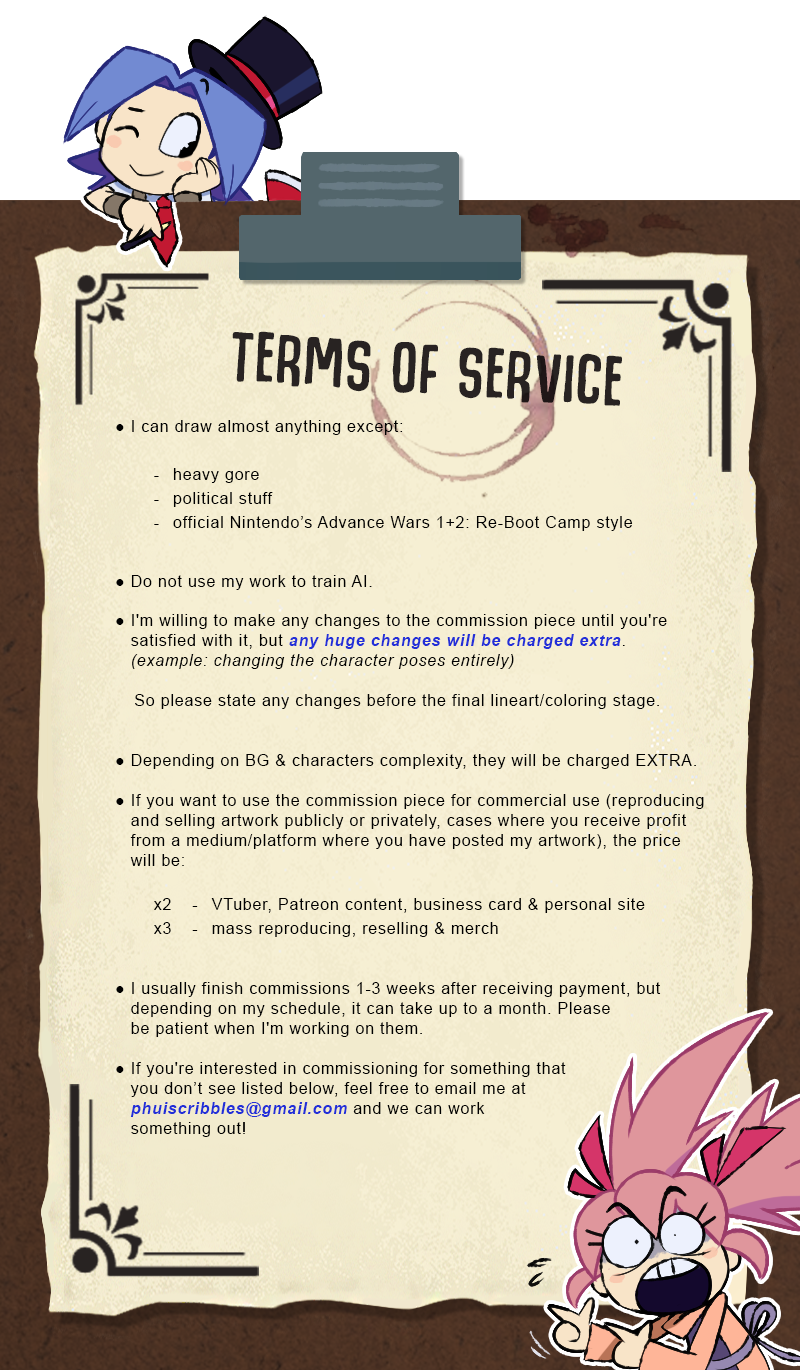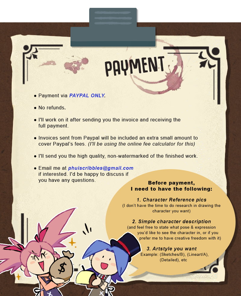 (Note: You can ask for specific color for the character. If not, I will choose whichever color I find fit)Halfbody each ................. $70